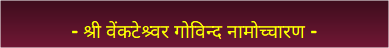 | श्रीनिवास श्री गोविन्दा | वेंकटेश श्री गोविन्दा | भक्तवत्सल श्री गोविन्दा | भागवतप्रिय श्री गोविन्दा | नित्य निर्मल श्री गोविन्दा | नीलमेघश्याम श्री गोविन्दा | पुराणपुरष श्री गोविन्दा | पुंडरीकाक्ष श्री गोविन्दा | गोविन्दा हरि गोविन्दा | गोकुलनन्दन श्री गोविन्दा | गोविन्दा हरि गोविन्दा | गोकुलनन्दन श्री गोविन्दा | नंदनवन श्री गोविन्दा | नवनीतचोर श्री गोविन्दा | पशुपालक श्री गोविन्दा | पापविमोचन श्री गोविन्दा | दुष्टसंहार श्री गोविन्दा | दुरितनिवारण श्री गोविन्दा | शिष्टपरिपालक श्री गोविन्दा | कष्टनिवारण श्री गोविन्दा | गोविन्दा हरि गोविन्दा | गोकुलनन्दन श्री गोविन्दा | गोविन्दा हरि गोविन्दा | गोकुलनन्दन श्री गोविन्दा | वज्रमकुटधर श्री गोविन्दा | गोपिजनलोल श्री गोविन्दा | गोवर्धनोध्दार श्री गोविन्दा | दशरथनन्दन श्री गोविन्दा | दशमुखमर्दन श्री गोविन्दा | पक्षिवाहन श्री गोविन्दा | पांडवप्रिय श्री गोविन्दा | गोविन्दा हरि गोविन्दा | गोकुलनन्दन श्री गोविन्दा | गोविन्दा हरि गोविन्दा | गोकुलनन्दन श्री गोविन्दा | मत्स्य कूर्म श्री गोविन्दा | मधुसूदन हरि गोविन्दा | वराह नरसिंह श्री गोविन्दा | वामन भृगुराम श्री गोविन्दा | बल रामानुज श्री गोविन्दा | बौध्द कल्किधर श्री गोविन्दा | वेणुगानप्रिय श्री गोविन्दा | वेंकटरमण श्री गोविन्दा | गोविन्दा हरि गोविन्दा | गोकुलनन्दन श्री गोविन्दा | गोविन्दा हरि गोविन्दा | गोकुलनन्दन श्री गोविन्दा | सीतानायक श्री गोविन्दा | आश्रितपालक श्री गोविन्दा | दीनजनपोषज श्री गोविन्दा | धर्मसंस्थापक श्री गोविन्दा | अनाथरक्षक श्री गोविन्दा | आपध्दान्धव श्री गोविन्दा | शणागतवत्सल श्री गोविन्दा | करुणासागर श्री गोविन्दा | गोविन्दा हरि गोविन्दा | गोकुलनन्दन श्री गोविन्दा | गोविन्दा हरि गोविन्दा | गोकुलनन्दन श्री गोविन्दा | कमललोचन श्री गोविन्दा | कामितफलदाता श्री गोविन्दा | पापविनाशक श्री गोविन्दा | पाहि मुरारे श्री गोविन्दा | मुद्रांकित श्री गोविन्दा | वत्सांकित श्री गोविन्दा | धरणीनायक श्री गोविन्दा | दिनकर तेज श्री गोविन्दा | गोविन्दा हरि गोविन्दा | गोकुलनन्दन श्री गोविन्दा | गोविन्दा हरि गोविन्दा | गोकुलनन्दन श्री गोविन्दा | पद्मावती प्रिय श्री गोविन्दा | प्रसन्नमूर्ति श्री गोविन्दा | अभयहस्तद्रदर्शक श्री गोविन्दा | मर्त्यावतार श्री गोविन्दा | शंखचक्रधर श्री गोविन्दा | शारग्डगदाधर श्री गोविन्दा | विरजातटस्थ श्री गोविन्दा | विरोधिमर्दन श्री गोविन्दा | गोविन्दा हरि गोविन्दा | गोकुलनन्दन श्री गोविन्दा | गोविन्दा हरि गोविन्दा | गोकुलनन्दन श्री गोविन्दा | सालग्राम धर श्री गोविन्दा | सहस्त्रनाम श्री गोविन्दा | लक्ष्मीवल्लभ श्री गोविन्दा | लक्ष्मणाग